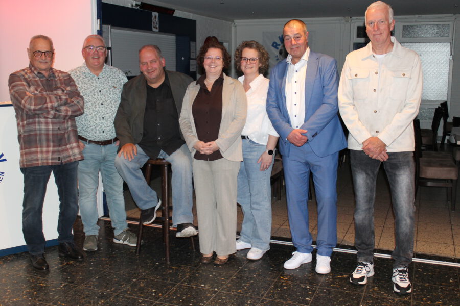 v.l.n.r. Wiel Choinowski (40 jaar lid), voorzitter Rene Hanssen, Harry Vermeulen (25 jaar lid), Suzanne Jaminon-Hakens (25 jaar lid), Mariëlle Smeets-Hakens (25 jaar lid), Rob Vroemen (25 jaar lid) en spreekstalmeester John Hollanders.