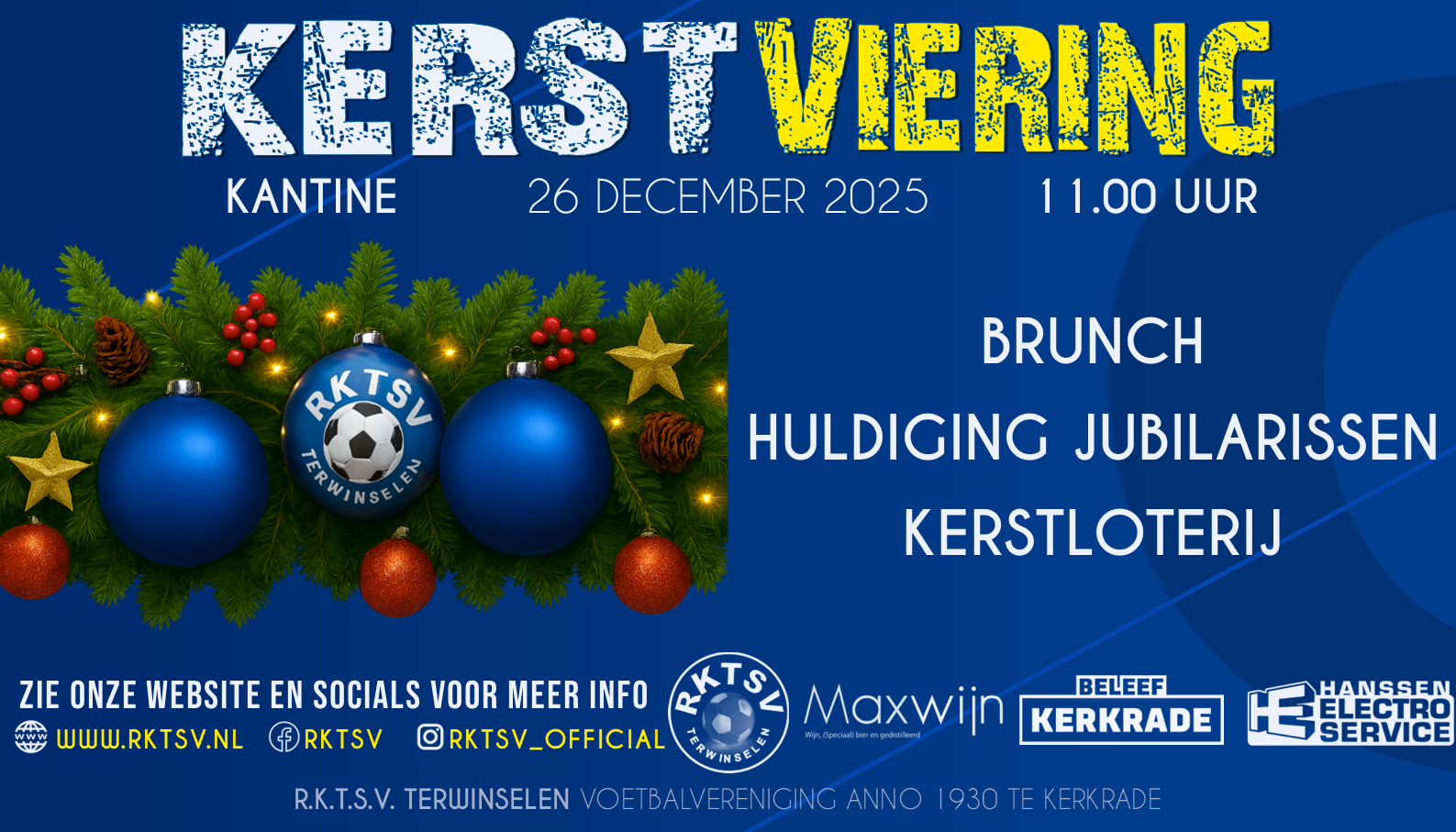 Traditiegetrouw is ook dit jaar weer op 2e kerstdag de RKTSV kerstviering in de kantine op ons sportcomplex. Deze viering begint met een brunch. Aansluitend volgt de huldiging van onze jubilarrissen en als laatste de grote kerstverloting met mooie prijzen.